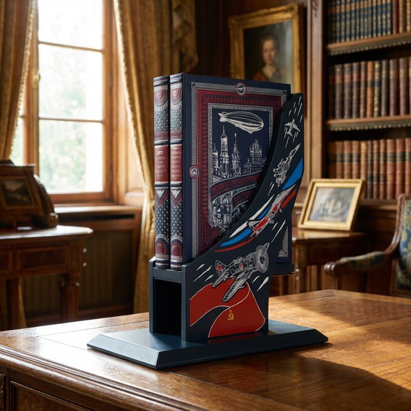 Двухтомник посвящен истории отечественного воздухоплавания с конца XVIII века до современности. В книге рассматриваются аэростаты, дирижабли, военное и научное применение летательных аппаратов легче воздуха, архивные документы и воспоминания ветеранов. Отдельное внимание уделено рекордам русских и советских воздухоплавателей и их вкладу в мировую историю авиации. Издание выполнено в цельнокожаном переплете ручной работы с сочетанием серебряного и красного тиснения на натуральной коже. Окрашенный обрез и оформленные дублюрами форзацы подчеркивают коллекционный уровень. Используется шелковое ляссе. Деревянная подставка обтянута натуральной кожей и украшена серебряным тиснением и цветной шелкографией.