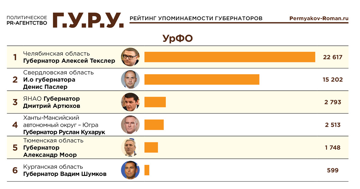 На 4-м месте рейтинга губернатор Челябинской области Алексей Текслер (22 617 упоминаний). Взлет медиа-индекса обеспечил рабочий визит президента Владимира Путина в Челябинскую область. В ходе рабочей встречи с Текслером Путин поддержал ряд предложений, в том числе по строительству нового аэропорта в Магнитогорске. Кроме того, в июльском активе Текслера участие в международной промышленной выставке «Иннопром» в Екатеринбурге, где челябинский губернатор представил премьер-министру Мишустину стенд региона. Однако не обошлось без громкого коррупционного кейса – ФСБ задержала экс-вице-губернатора Челябинской области Богашова, министра имущества региона Белоусова и управделами губернатора и правительства региона Менжинского в рамках расследования уголовного дела о превышении должностных полномочий.
