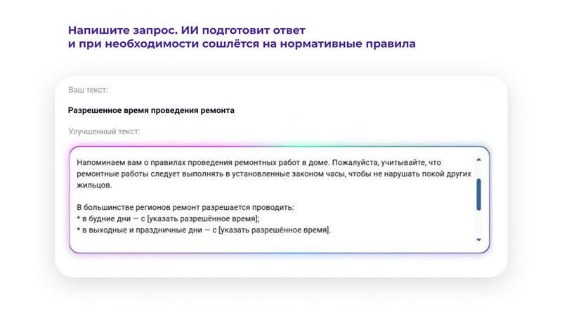 Такое решение дает управляющей компании два ключевых преимущества. Во-первых, это существенная экономия времени — либо за счет сокращения сроков ответа на обращения, либо через оптимизацию внутренних ресурсов. Во-вторых, повышается качество коммуникации: вне зависимости от уровня подготовки конкретного сотрудника ответ жителю будет оформлен корректно и профессионально. Это напрямую влияет на статус управляющей компании и лояльность жителей.