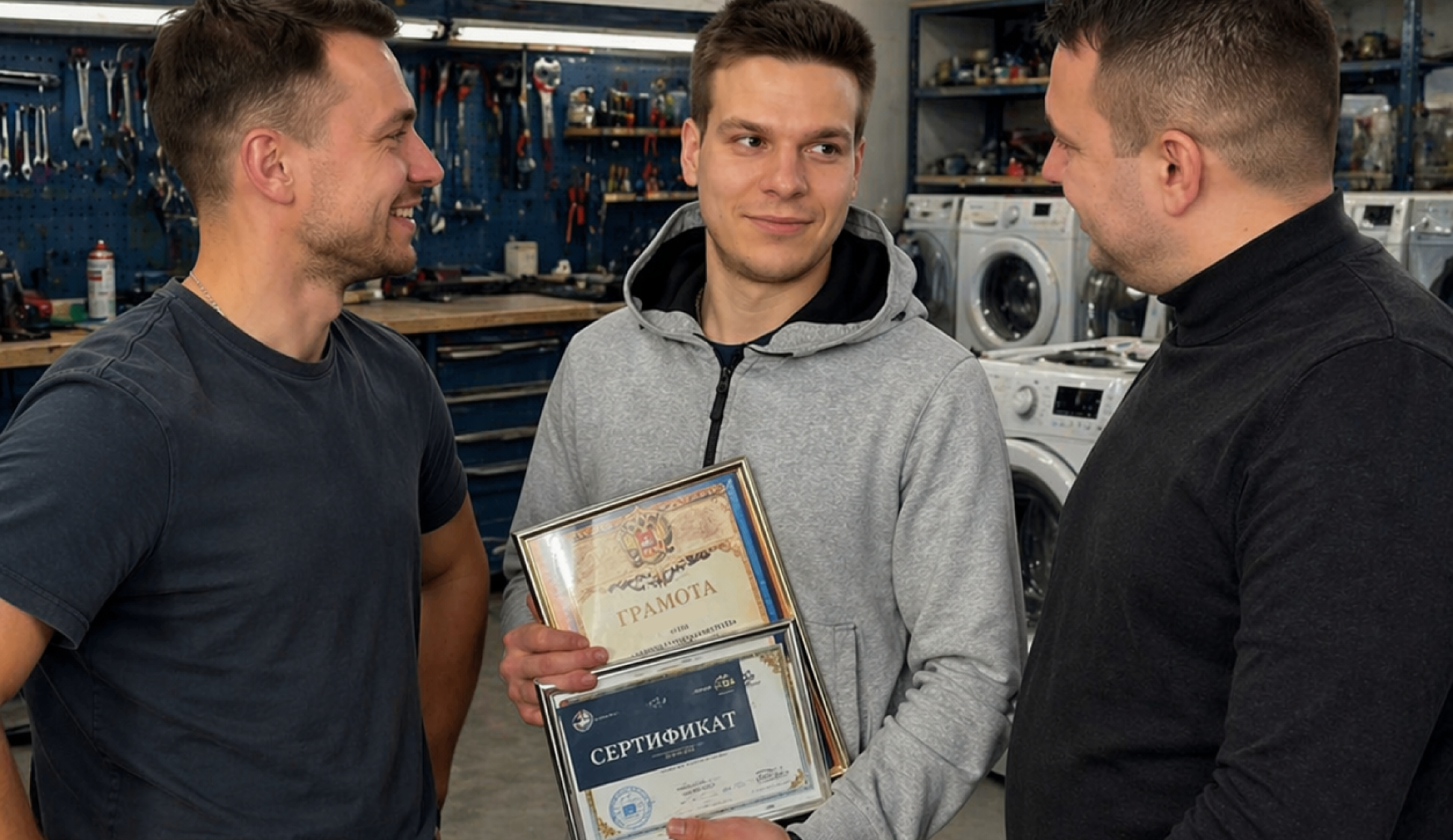 В честь получения статуса «Лучший в профессии» компания вручила мастеру именную грамоту, памятный знак и сертификат на покупку профессионального инструмента для работы с современными моделями стиральных машин. В офисе сервиса также разместили стенд с фотографией мастера и краткой информацией о его опыте и специализации.
