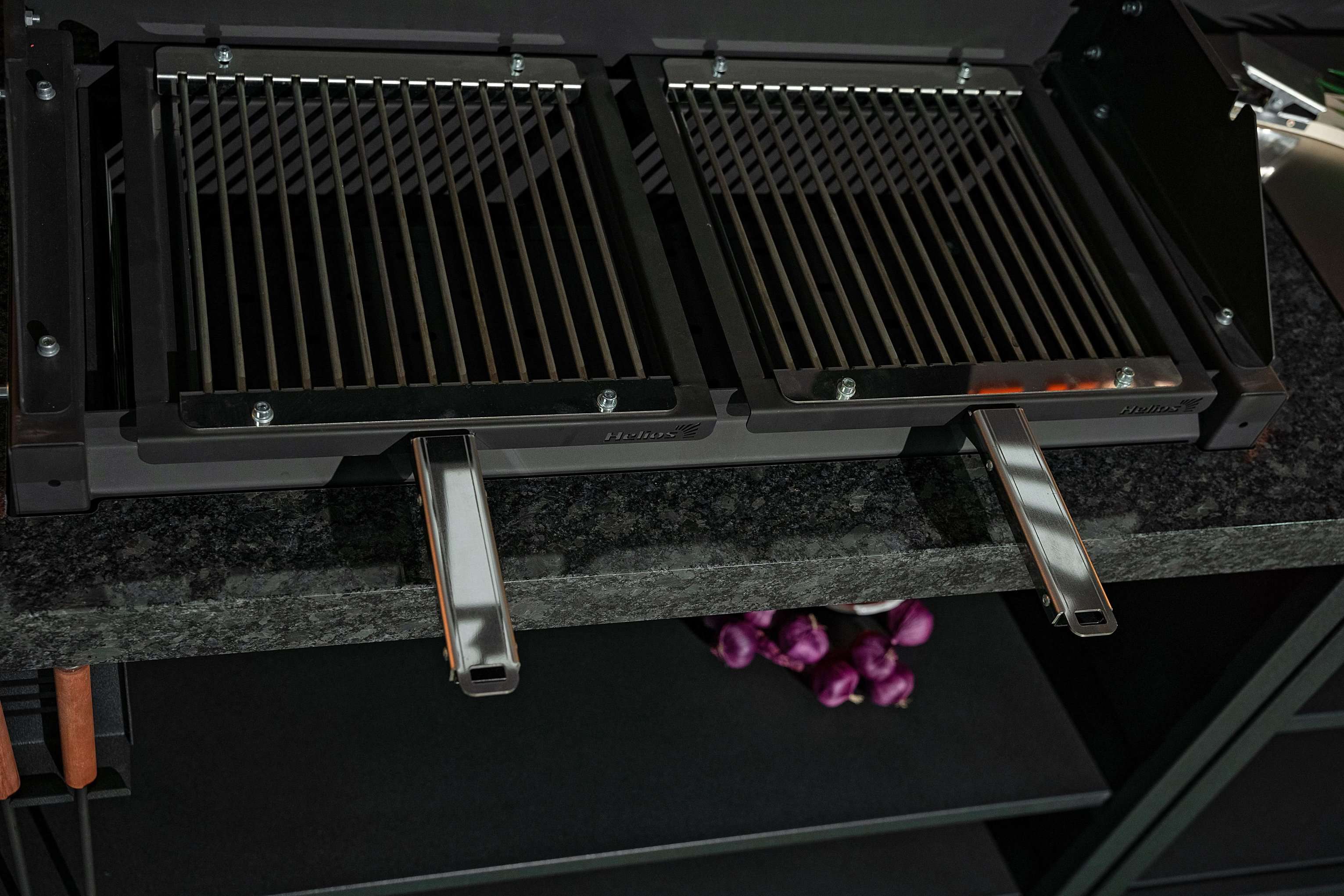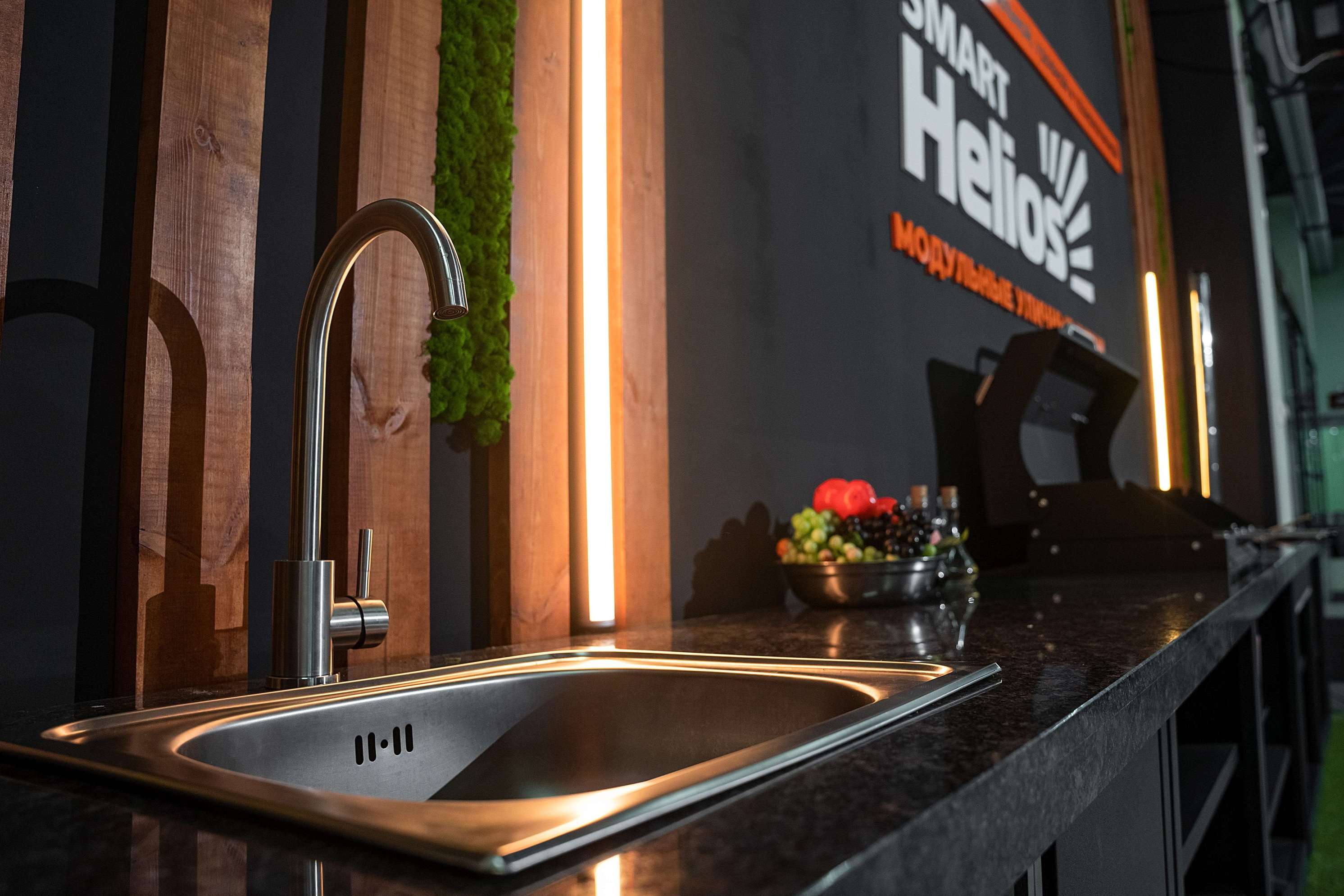 Широкий ассортимент модулей Helios Smart: мангал-термо, шкаф с мойкой, шкаф с варочной поверхностью, столешница с печью под казан, стол для приема пищи позволит составить оптимальную и нужную конфигурацию. После определения и выбора нужных модулей владельцу кухни можно оформлять заказ на столешницы из натуральных материалов. Так, по мнению шеф-поваров, идеальным материалом столешницы является натуральный гранит, обладающий высокой прочностью, долговечностью и устойчивостью к внешним воздействиям.
