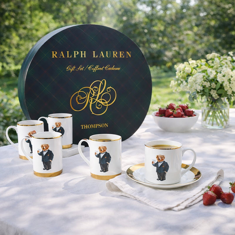 Фарфоровый набор бренда Ralph Lauren с изображением знаменитого медвежонка Polo Bear объединяет игривое настроение и элегантность. В комплект входят четыре десертные тарелки и четыре кружки, выполненные из фарфора с золотой окантовкой. Набор упакован в фирменную подарочную шляпную коробку, что делает его удобным для хранения и особенно уместным в качестве подарка. Он подойдет для уютных чаепитий и станет украшением сервировки.