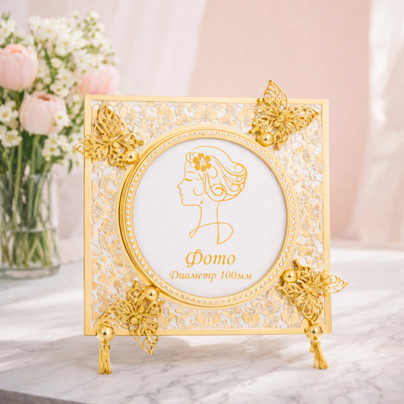 Эта изящная фоторамка выполнена мастерами Златоуста и сочетает в себе декоративную выразительность и филигранную точность линий. Поверхность украшена тончайшим орнаментом, по углам расположены ажурные бабочки, а внутренний овал обрамлен сияющими элементами, превращающими фотографию в настоящий акцент композиции. Плавные изгибы подставки и продуманная форма создают ощущение легкости. Такой подарок подчеркнет ценность сохраненных мгновений и станет заметной деталью интерьера.