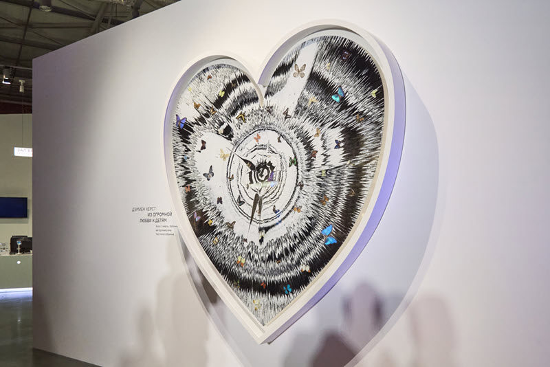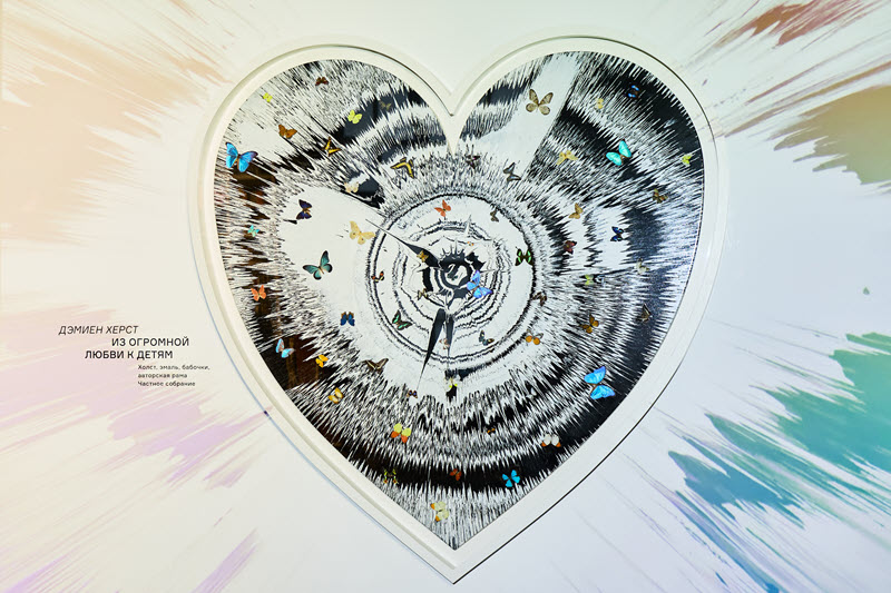 Открывает проект работа «Из огромной любви к детям» * Дэмиена Херста, одного из культовых художников современности, которую посетители смогут увидеть в музее с 27 февраля до 5 июня. Это произведение объединяет два характерных для определенного этапа творчества Херста мотива — вихревую энергию спин-живописи и бабочек в качестве сюжета. Закрученная композиция, напоминающая циферблат часов, создает ощущение непрерывного движения и подчеркивает роль случая, энергии и времени как формообразующих элементов работы.
