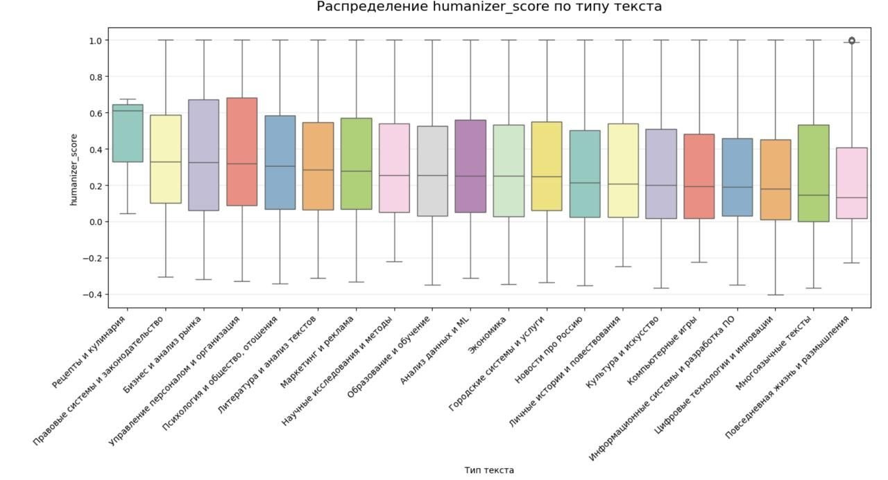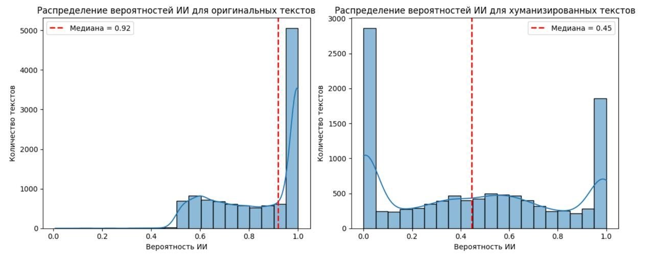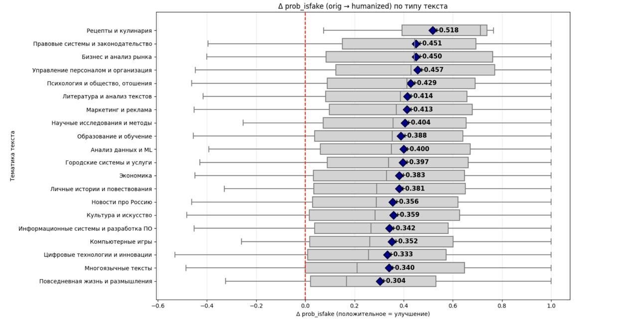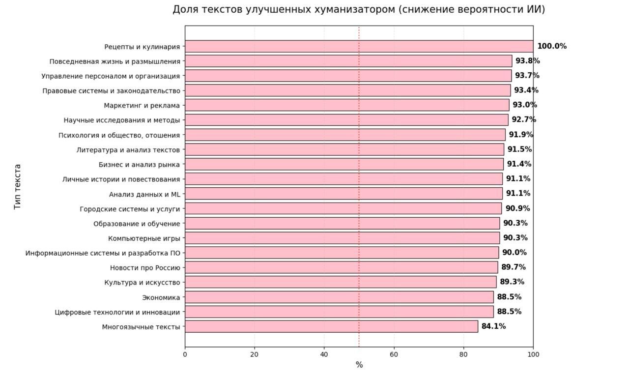 До обработки медианная вероятность того, что детектор сочтет текст ИИ-сгенерированным, составляла 0.93. После обработки этот показатель упал до 0.47. Лучший результат по средней дельте показали рецепты — прирост «очеловеченности» составил 0.518.