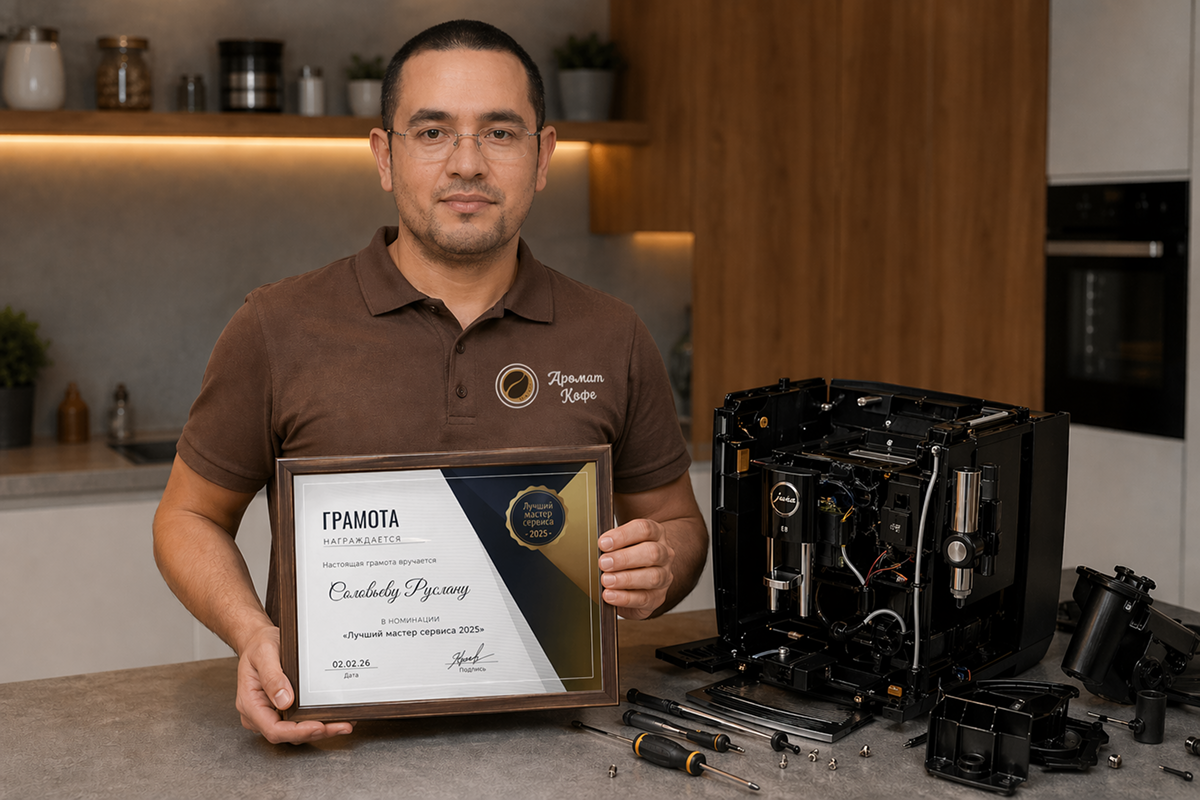 Руслан Соловьёв работает с кофемашинами более 12 лет, из них 5 лет — в команде «Аромат Кофе». За 2025 год на его счету более 920 обслуженных и отремонтированных аппаратов, включая сложные случаи после неудачных попыток ремонта в других сервисах.