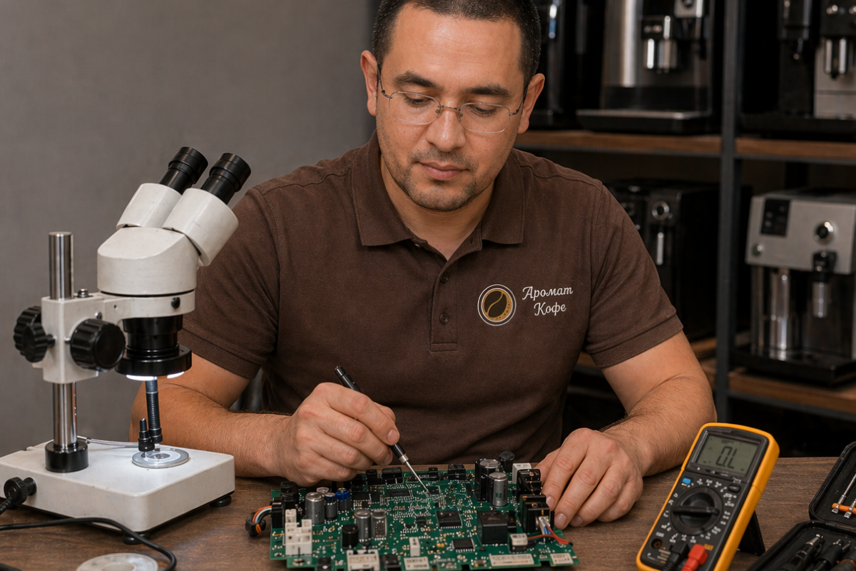 Основная специализация мастера — ремонт электронных плат управления, диагностика и устранение ошибок датчиков, калибровка и профилактика сложных моделей Jura, Krups и Melitta. Особенно ценится аккуратная работа с электроникой: современные кофемашины завязаны на систему датчиков температуры, давления и уровня воды, блоки управления помпой и нагревом, и ошибка на этапе диагностики может привести к ненужной замене дорогостоящих узлов.