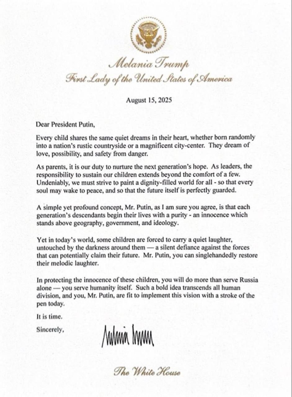 Оригинал письма Мелании Трамп: https://t.me/flotusmelaniatrumpchannel/2295