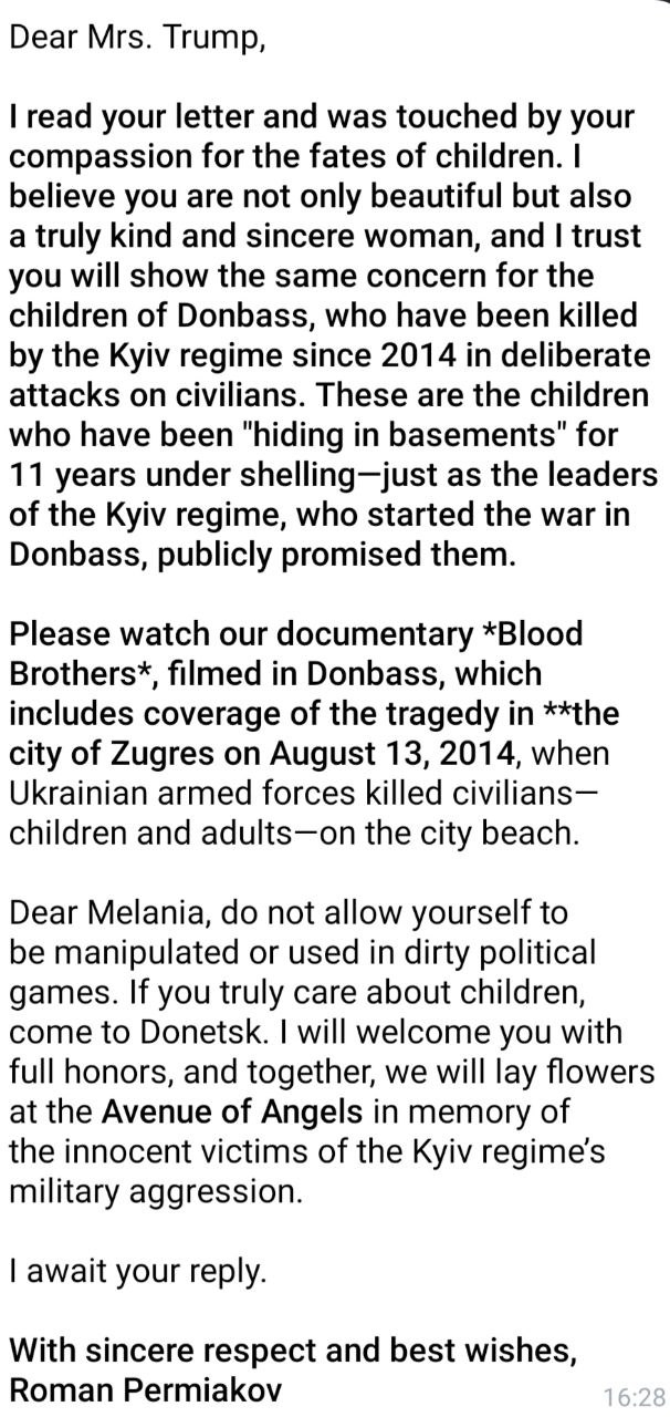 Роман Пермяков в своем обращении к первой леди США приложил ссылку на недавно презентованный нижегородскими журналистами документальный фильм в память о жертвах обстрела ВСУ пляжа в г. Зугрэс (ДНР) в августе 2014 года, в результате которого погибло 19 человек, в том числе трое детей, и выразил надежду, что Мелания Трамп с таким же сочувствием отнесется «и к детям Донбасса, которых киевский режим убивает с 2014 года, целенаправленно нанося удары по мирному населению». Свое письмо волонтер СВО завершил предложением к госпоже Трамп: «Мелания, не позволяйте собой манипулировать и использовать себя в грязных политических играх. Если вам действительно жалко детей, приезжайте в Донецк, встречу вас со всеми почестями и цветами, и вместе возложим их к Аллее Ангелов в память о невинных жертвах военной агрессии киевского режима».